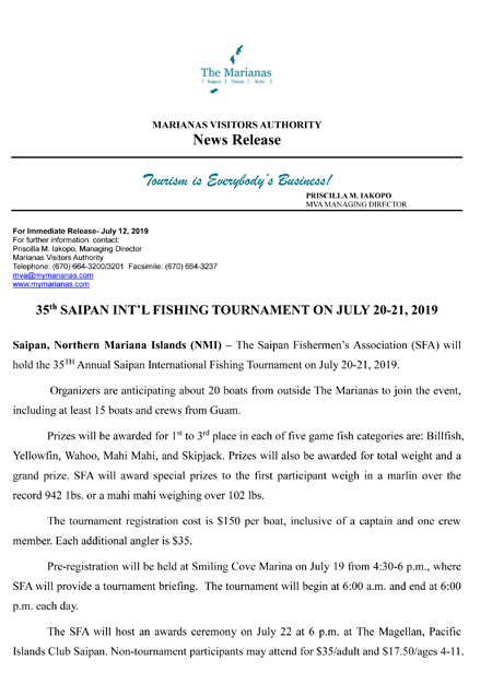 SAIPAN 35th Saipan International Fishing Tournament Cultural Events Sat, 07/20/2019 - 12:00 - Sun, 07/21/2019 - 12:00