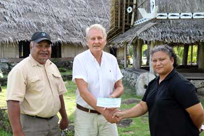 Colonia, Yap, Oct 15, 2018. The Yap Living History Museum in the heart of Colonia, the island’s center of commerce and government, has received a generous donation from a group of Bank of Guam employees. Jamie P. Gilmar (right), Bank of Guam Operations Manager in Yap, delivered the check to Don Evans (center), Chairman of the Board, Yap Living History Museum, and Tom Tamangmow (left), YVB project development manager, in front of the Museum’s traditional buildings at the outdoor site.