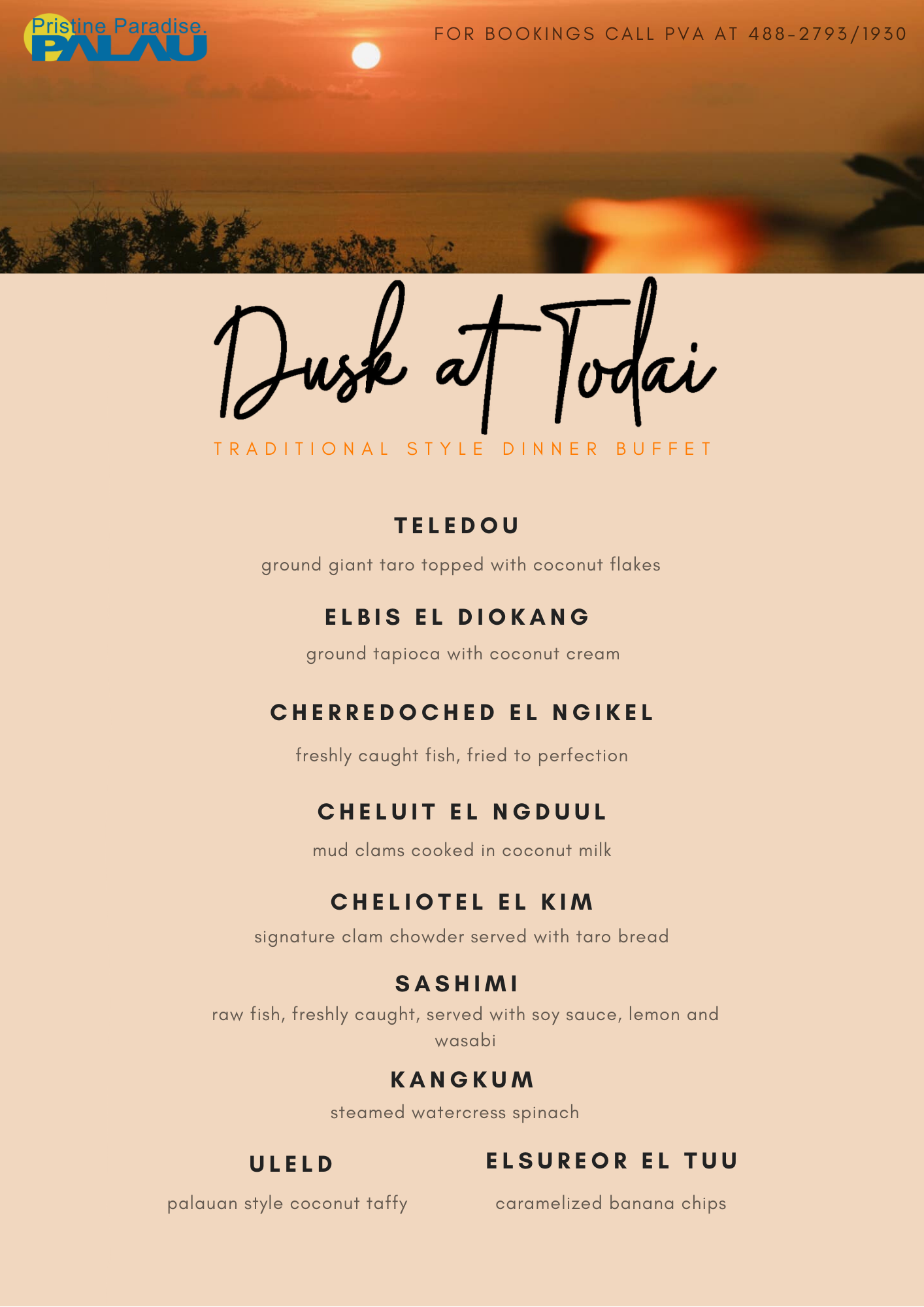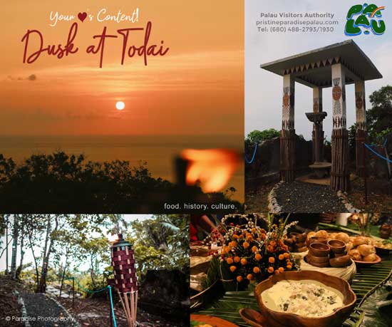Palau Visitors Authority is excited to announce the monthly Dusk at Todai happening this month on the November 16th at Todai, Ngarchelong State. The program begins with a tour from 5pm to 6pm. Dinner will start at 6:30 pm followed by music and dance entertainments. Along with the tour, show and dinner locals will be there to showcase weaving and carving demonstration. This program was established to promote local food, culture, and art as well as to help develop tourist activities within each state that will benefit the community.