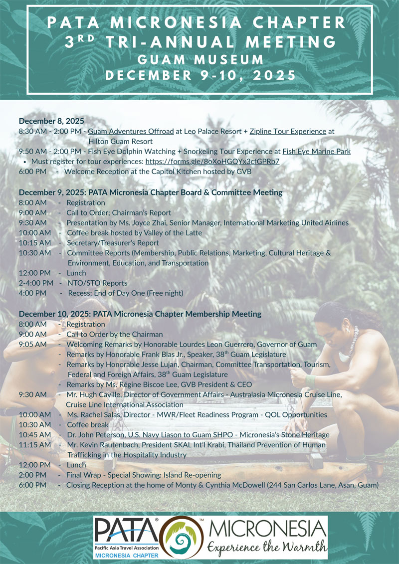 Mark your calendar for the PATA MICRONESIA CHAPTER 3rd TRI-ANNUAL meeting in Guam from December 8-10, 2025. Join us for meaningful discussions, networking, and collaboration within the PATA Micronesia Chapter. Your insights and active participation are vital to driving our initiatives and strengthening our community.