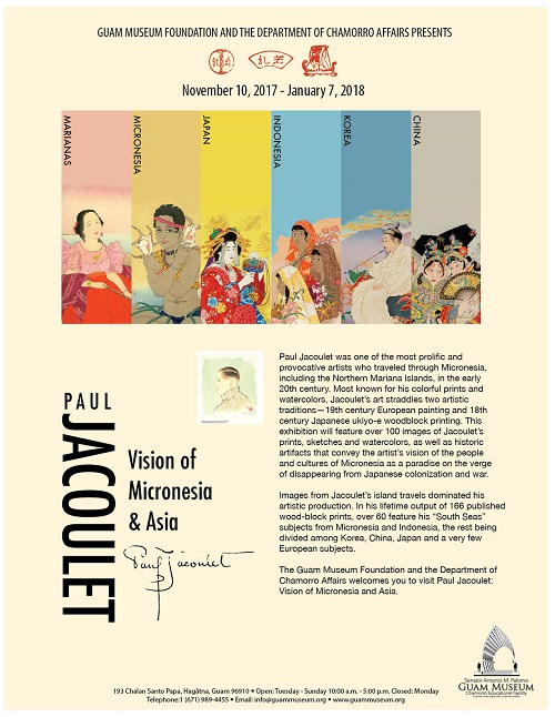 For Immediate Release, 7 November 2017 — (Hagåtña, Guam) Nearly eight decades after his first visit to Micronesia, the Guam Museum is pleased to announce its new exhibition of a collection of over 160 artworks by French artist Paul Jacoulet (1896-1960) at the Guam Museum’s Changing Exhibition Gallery. “Paul Jacoulet: Vision of Micronesia and Asia” will run from November 10, 2017 to January 7, 2018.