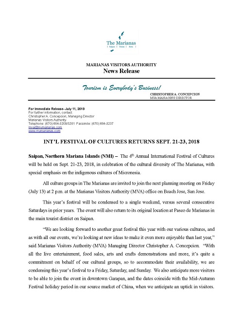 SAIPAN PR Intl Festival of Cultures Cultural Events Fri, 09/21/2018 - 12:00 - Sun, 09/23/2018 - 12:00 Click here to view the PR Intl Festival of Cultures