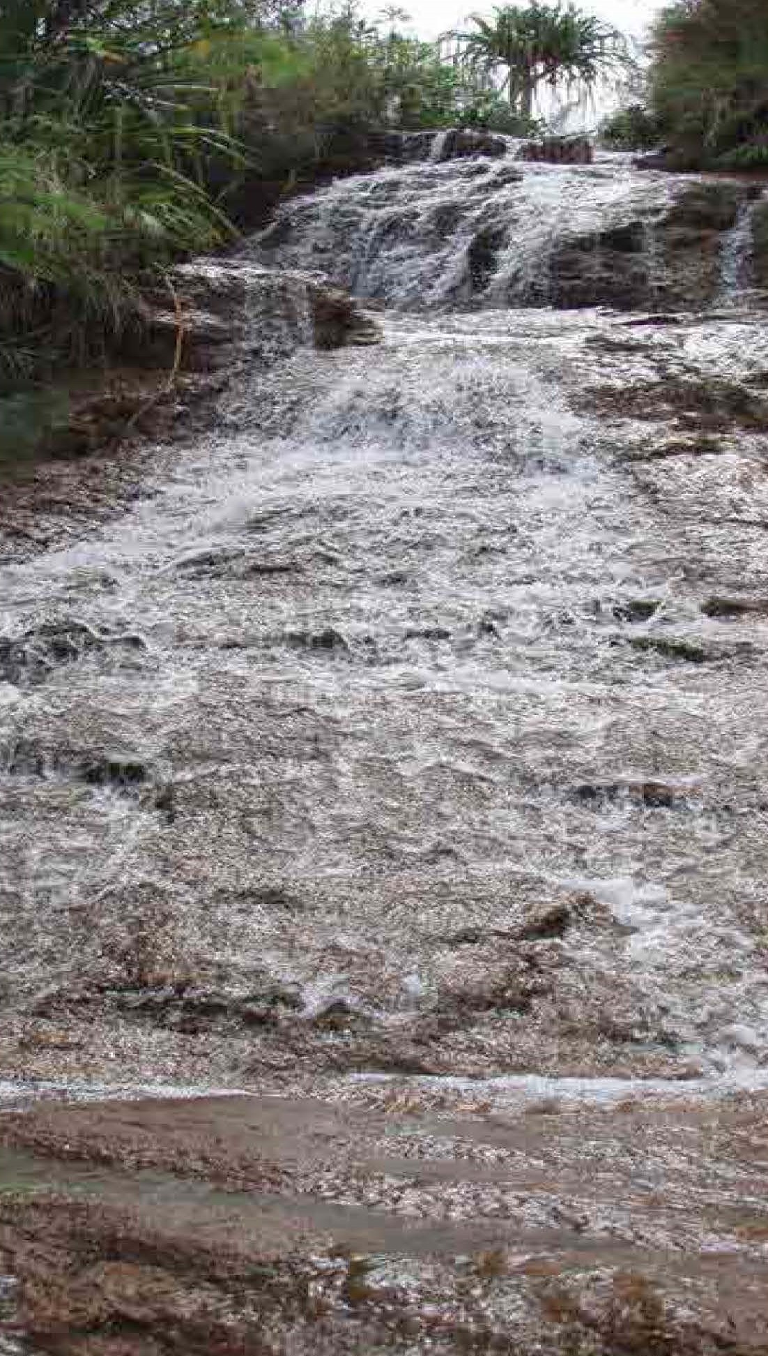 We follow a small cool green hidden stream full of small cascades and swim pools to journey to 3 big waterfalls on the upper Sella River in southern Guam. The adventurous can continue on to the false summit of Mt. Lamlam. Bring: 3 quarts water, get wet shoes, gloves, sun screen, insect repellent, lunch, and camera. Special conditions: Walking in water through a rocky river, steep slopes through sword grass, and climbing falls with a rope.
