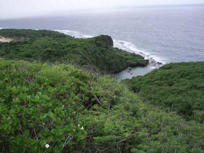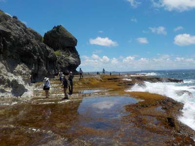 We descend to this scenic cove below Guam’s northeastern cliffs to swim and snorkel if the water is calm. If conditions are good we’ll also head north along the reef to the next cove. Bring: 2 quarts water, sturdy footwear, swim suit, snorkel gear, gloves, insect repellent, sun screen, lunch, and camera. Special conditions: A steep hill to climb, overgrown trail, and hiking over rough rocks.