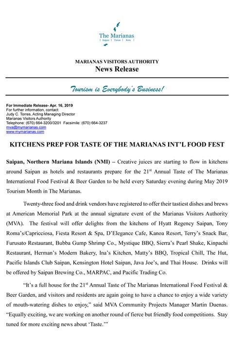 The 21st Annual Taste of the Marianas International Food Festival and Beer Garden will kick off on May 4, and continue every Saturday in May. This signature event has become a must-see for all visitors and residents and will feature various local and international cuisine, live entertainment, nightly competitions, and more. A top chef competition will feature chefs from all major resort hotels in The Marianas and the winner will be crowned the “Top Chef of The Marianas.” Join one of the largest events in The Marianas and spread the word!